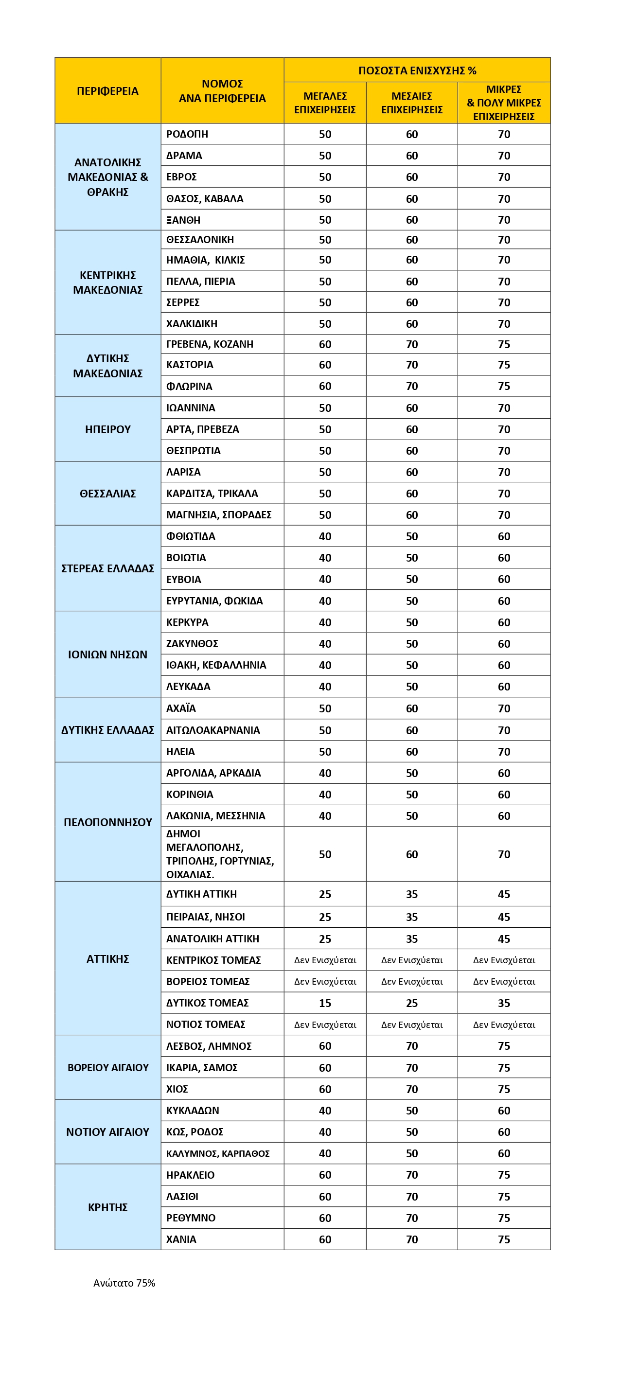 Τα ποσοστά ενίσχυσης, σύμφωνα με τον νέο Χάρτη Περιφερειακών Ενισχύσεων, απο το 2024, διαμορφώνονται ως εξής: